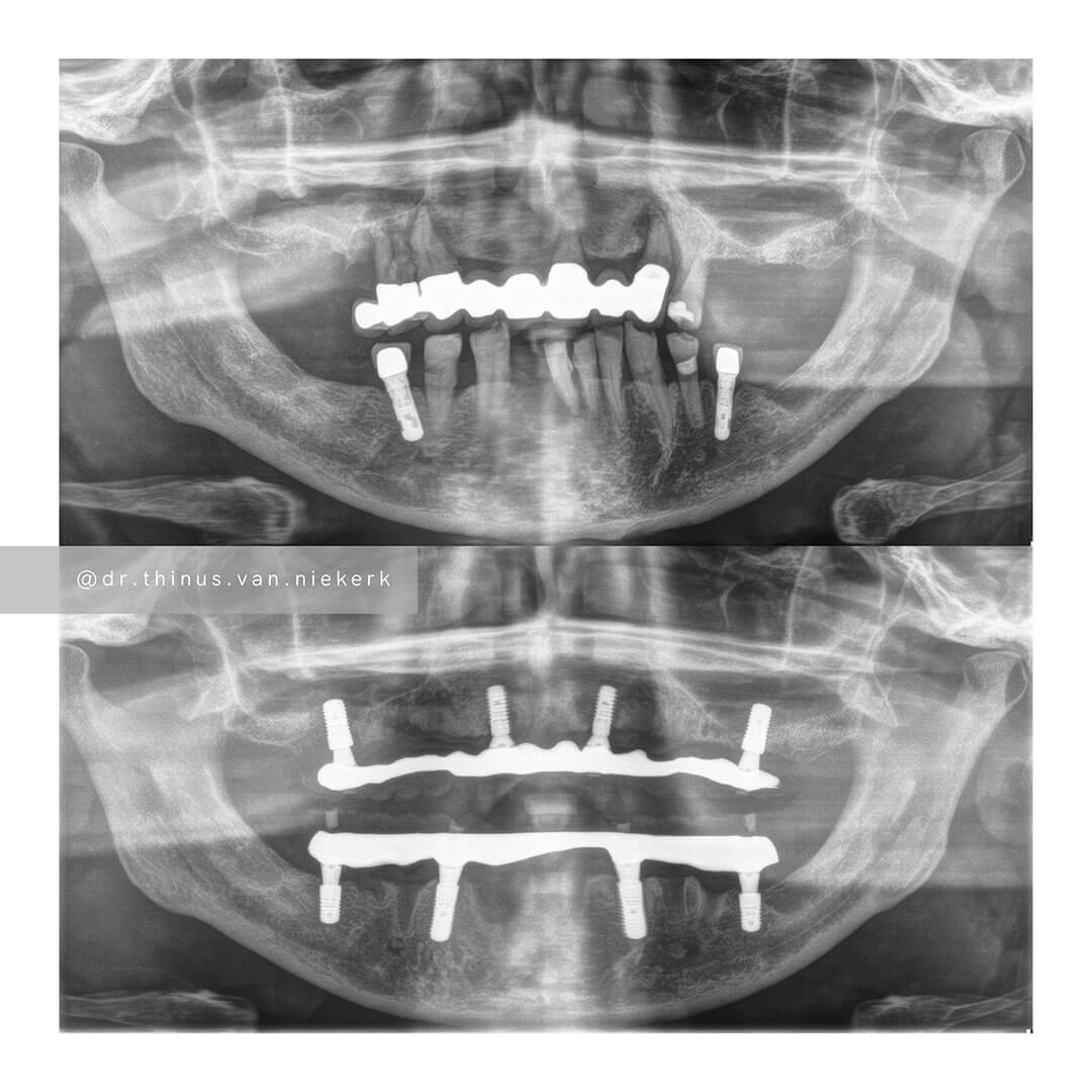 This was a landmark case for our clinic – being the first fully digitally-planned upper and lower rehabilitation. This case demonstrated the power and effectiveness of digital implant-surgery planning and CAD design software. No adjustments were needed at the placement of the final lower prosthesis.